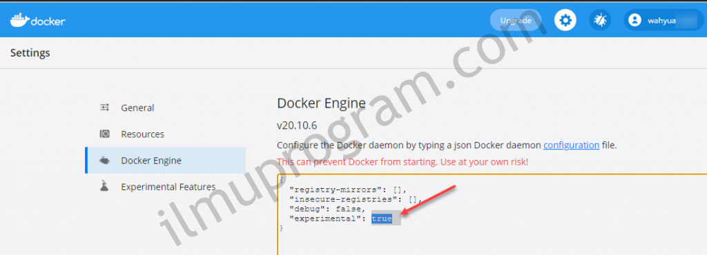 [2] Pada setting, pilih menu Docker Engine, pada Experimental = false, ganti Experimentar = true;